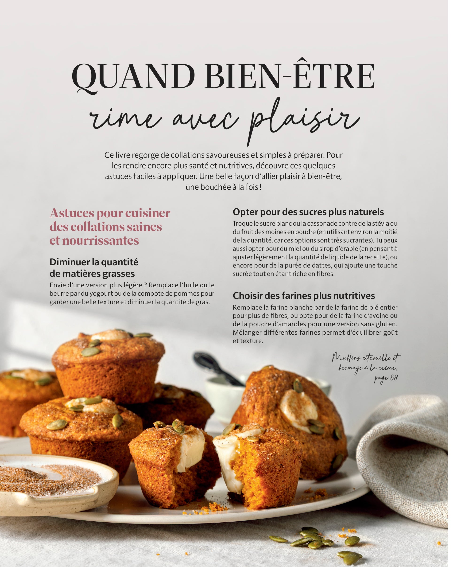 Au fil des pages, tu découvriras 80 recettes de collations sucrées et salées toujours décadentes, nourrissantes et faciles à intégrer dans ton quotidien. Une attention particulière a aussi été portée aux tout-petits dans une section spécialement conçue pour répondre à leurs besoins et plaire à leurs papilles.