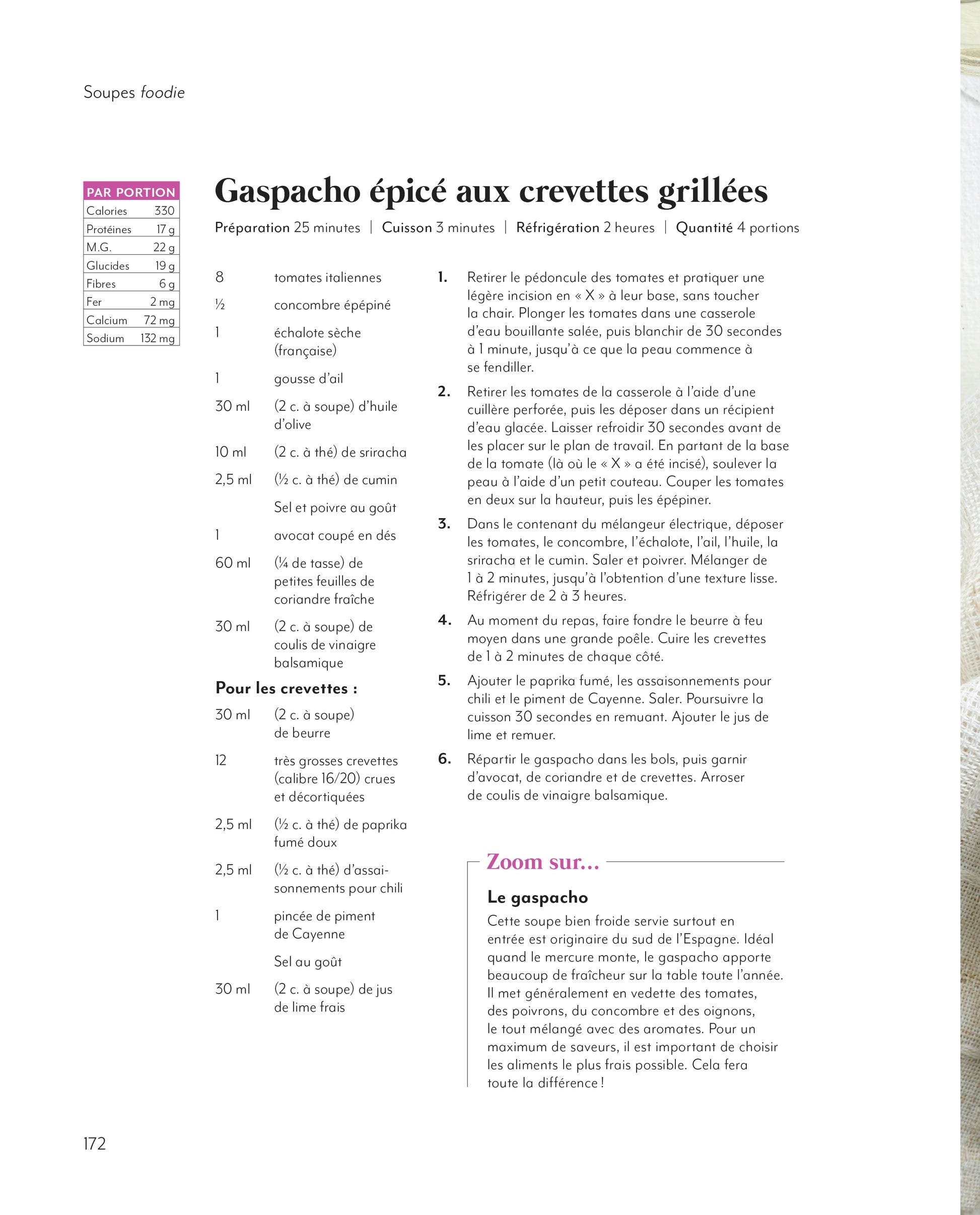 Que vous soyez conservateur ou plutôt adepte de saveurs inusitées, vous trouverez chaussure à votre pied dans ce livre qui regroupe 85 recettes de soupes classiques ou réinventées. Une délicieuse façon de renouveler le répertoire familial ! Nous vous souhaitons de renouer avec le plaisir de mitonner ces bouillons comme le faisaient nos ancêtres pour nourrir leur grande famille. Malgré les apparences, vous verrez qu’avec nos trucs, la préparation de ces mets réconfortants s’inscrit parfaitement bien dans nos vies modernes plus qu’occupées.